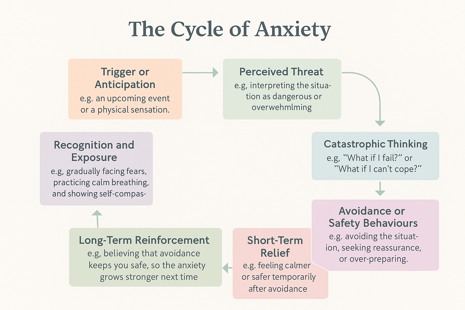 Anxiety tends to follow a predictable path, feeding on avoidance and short-term reliefs. By noticing where we are in the cycle, we can pause and make different choices...breathing, grounding, or gently facing what we fear, and over time, the pattern starts to lose its hold.