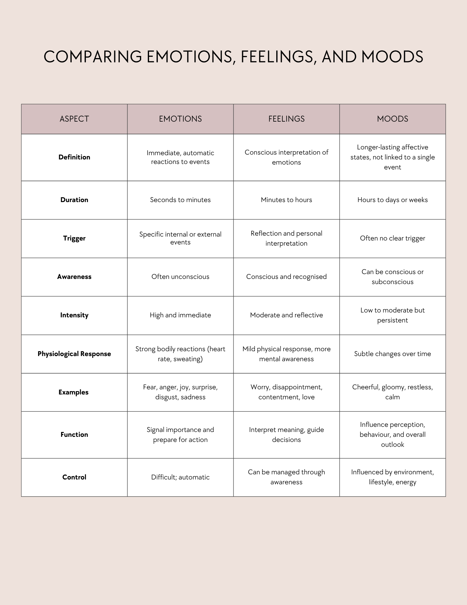 The following table summarises the key differences, making it easier to understand how emotions, feelings, and moods relate to each other: